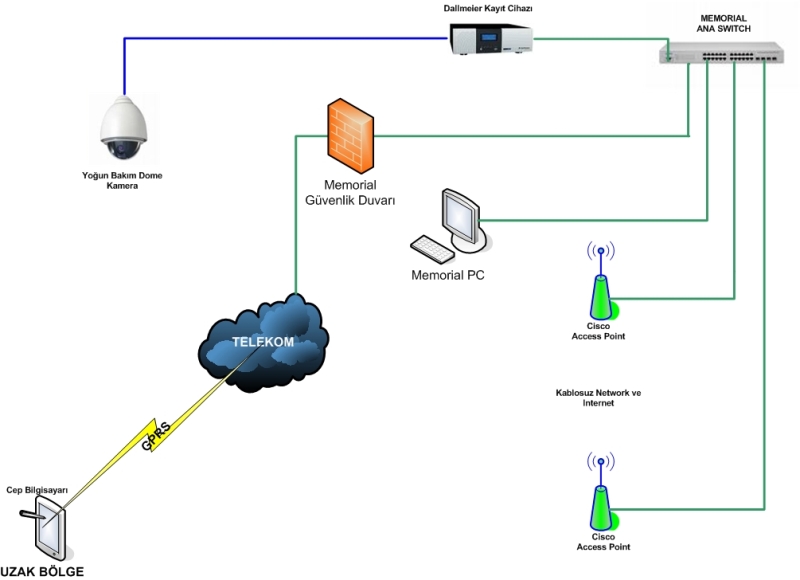 Memorial Hastanesi'nde mevcut tüm aktif video kameralarına (acil servis, kardioloji ve cerrahi yoğunbakımlar, servisler, ameliyathaneler) bir net work ile biribirine bağlanarak Biomedikal Departmanı'nda bulunan bir merkez bilgisayara bağlanmaktadır. Hastane içinde kablolu/kablosuz internet erişimi ile, hastane dışında dünyanın GSM i destekleyen her noktasından GPRS/EDGE ile iletişime girebilen cep telefonu aracılığı ile tüm hastalarımızın görüntülerine ulaşabiliyoruz.